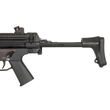 El SR5-SD6 es un excelente sub ametralladora de AEG, en el que el receptor superior es de chapa de acero, lo que distingue a esta serie de otras disponibles en el mercado. también aquí cargador y detalles como los soportes de las bandas. Otras piezas metálicas como cañón externo, la guía de la petaca o el silenciador son de aleación de aluminio. Al igual que en el original inflamable, la cubierta del supresor, el receptor inferior con grip , el pie de la petaca están hechos de plástico de nylon reforzado.